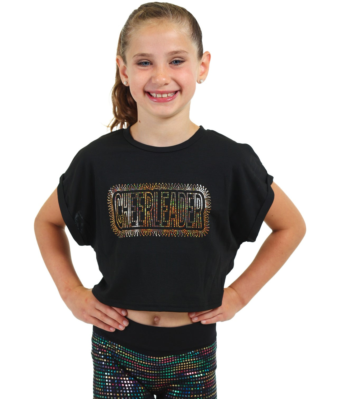 Cheerleaders love to sparkle and this top makes sure you do. Black rolled cap short sleeve crop top with a gorgeous design of gold spangles. Spangles are like sequins with all the shines but without the itch. Soft spangles feels great on the skin. Available in junior sizes/